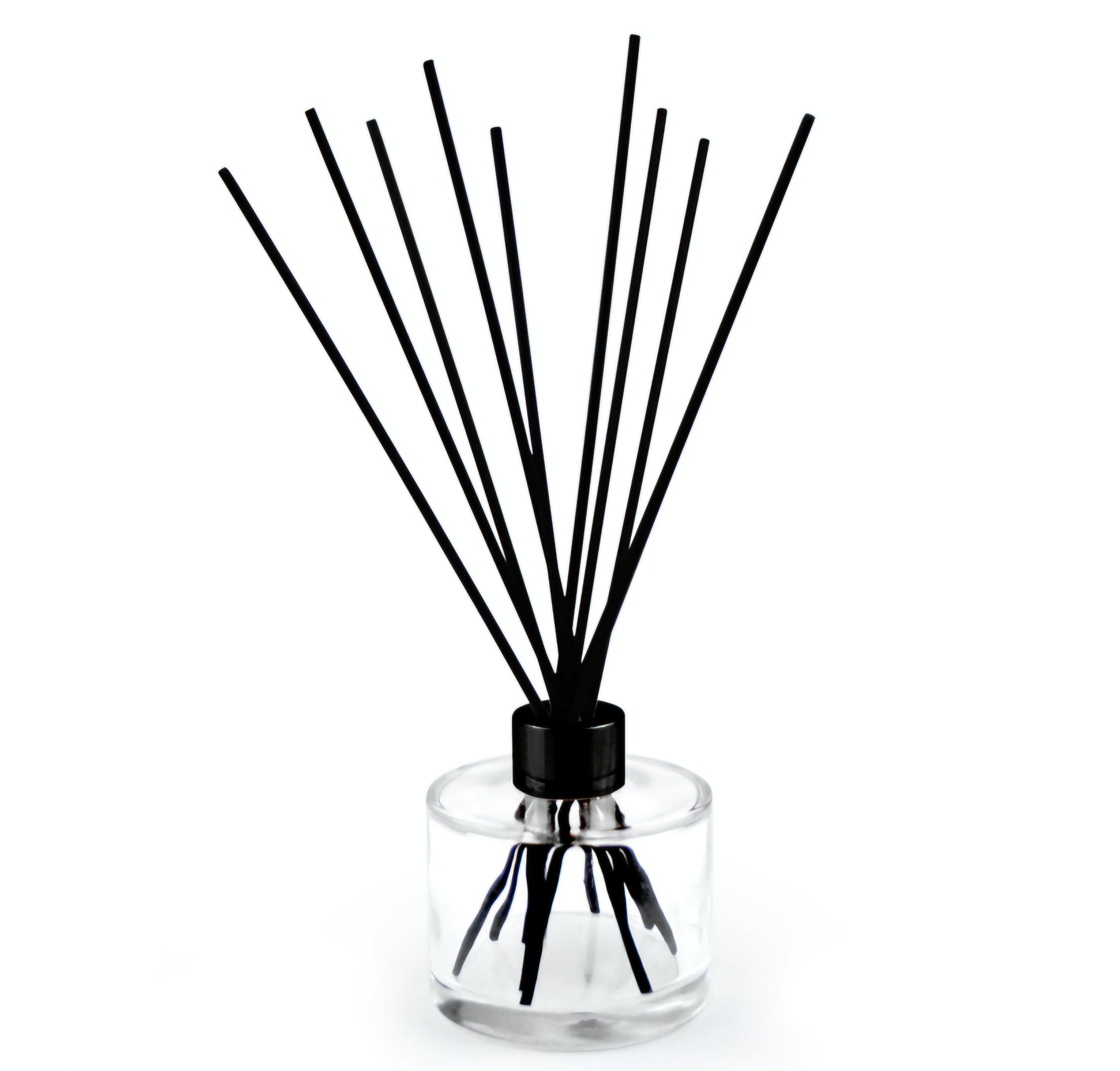 The reed diffuser bottle is 200ml round, clear and has a black cap.